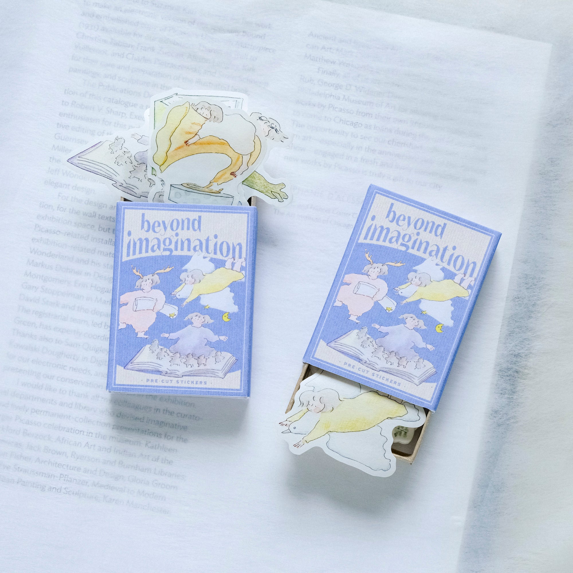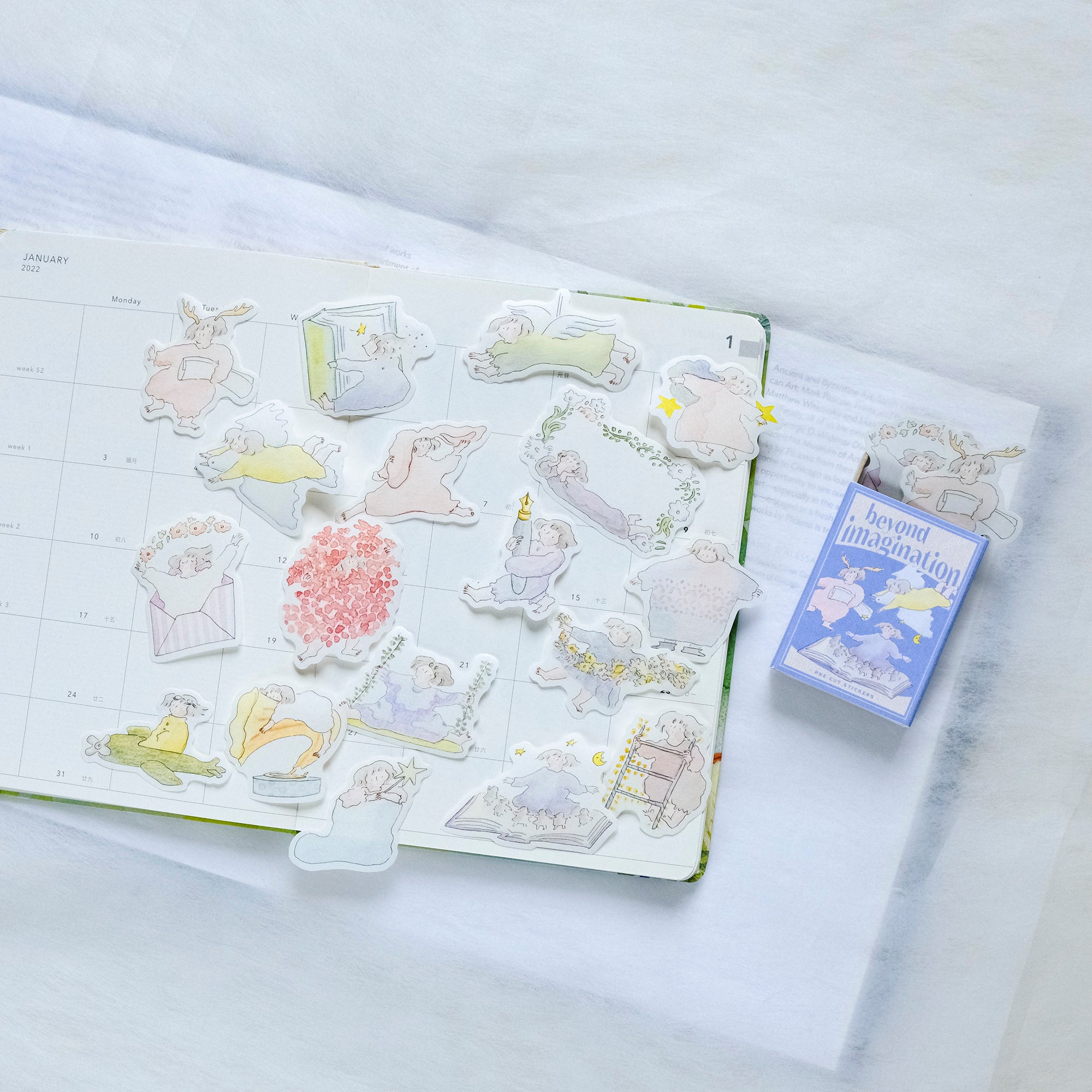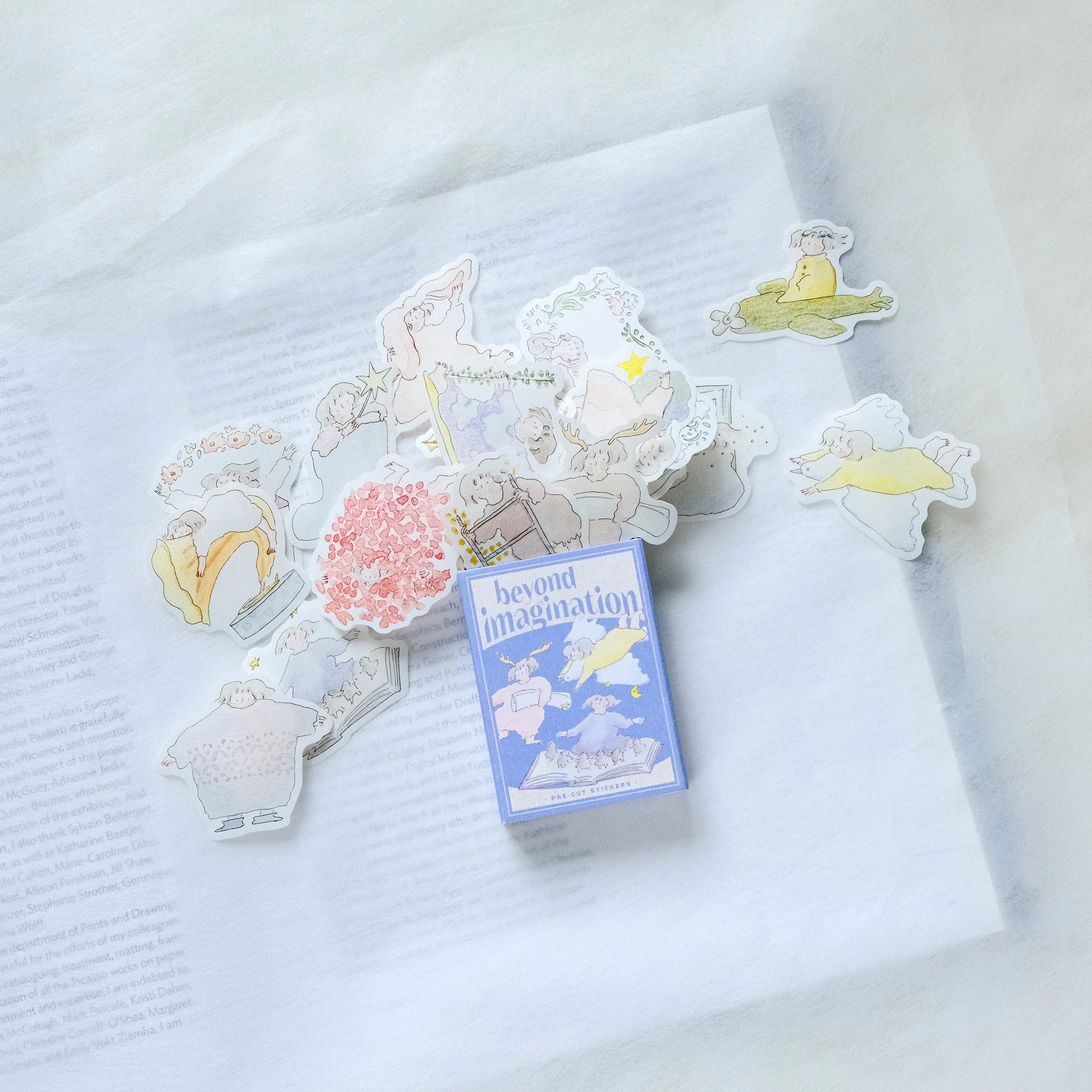 Introducing the "Beyond Imagination" flake stickers matchbox series from dodolulu! Perfect for journal lovers who appreciate beautiful illustrations, these die-cut stickers feature original artworks in watercolor and colored pencil. The designs feature adorable girls that will add a unique touch to your journals, planners, or any other project you have in mind. Get creative and make something special with the "Beyond Imagination" flake stickers matchbox series!