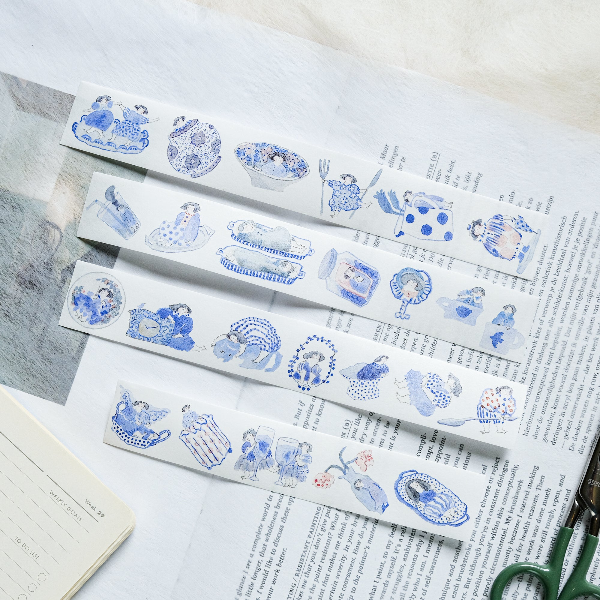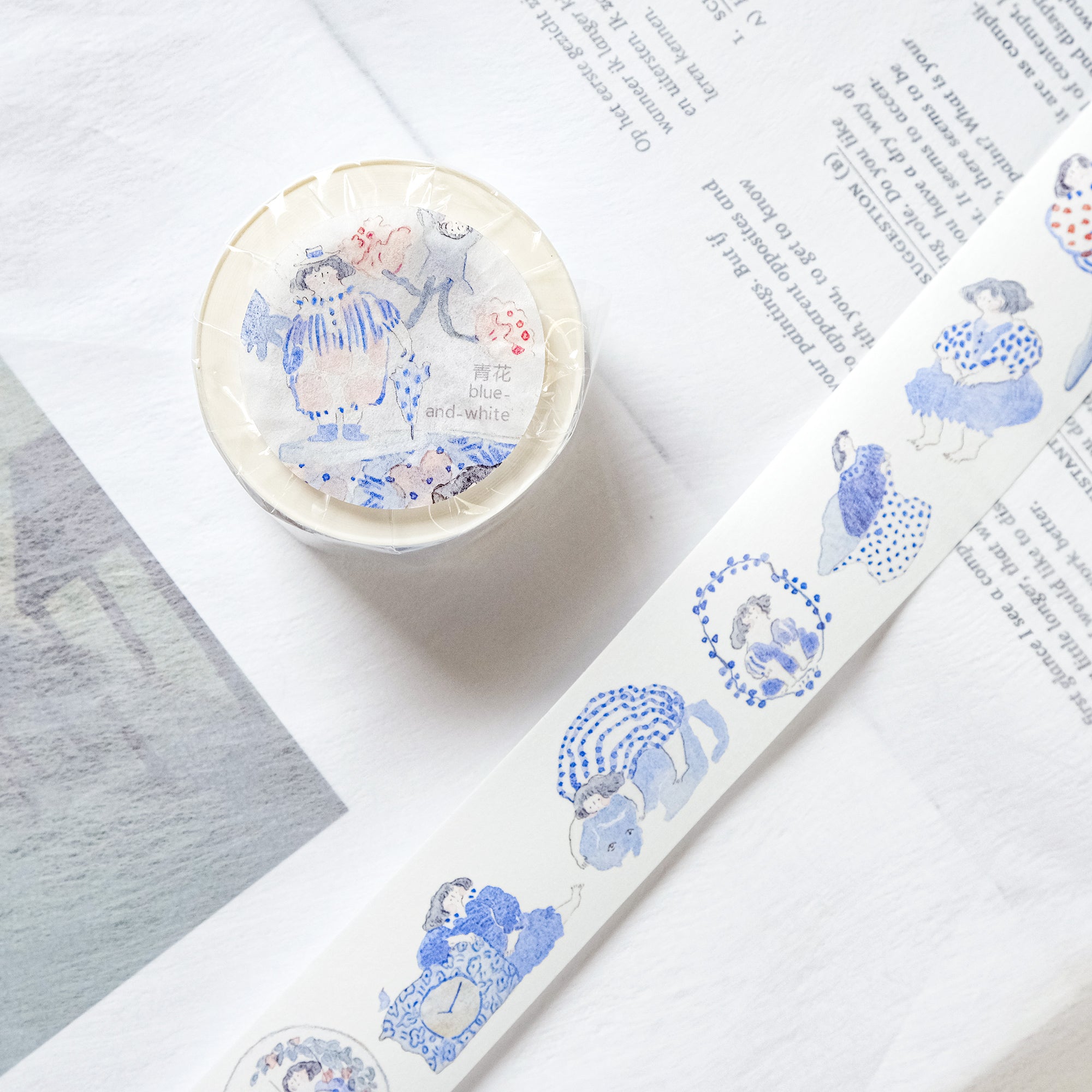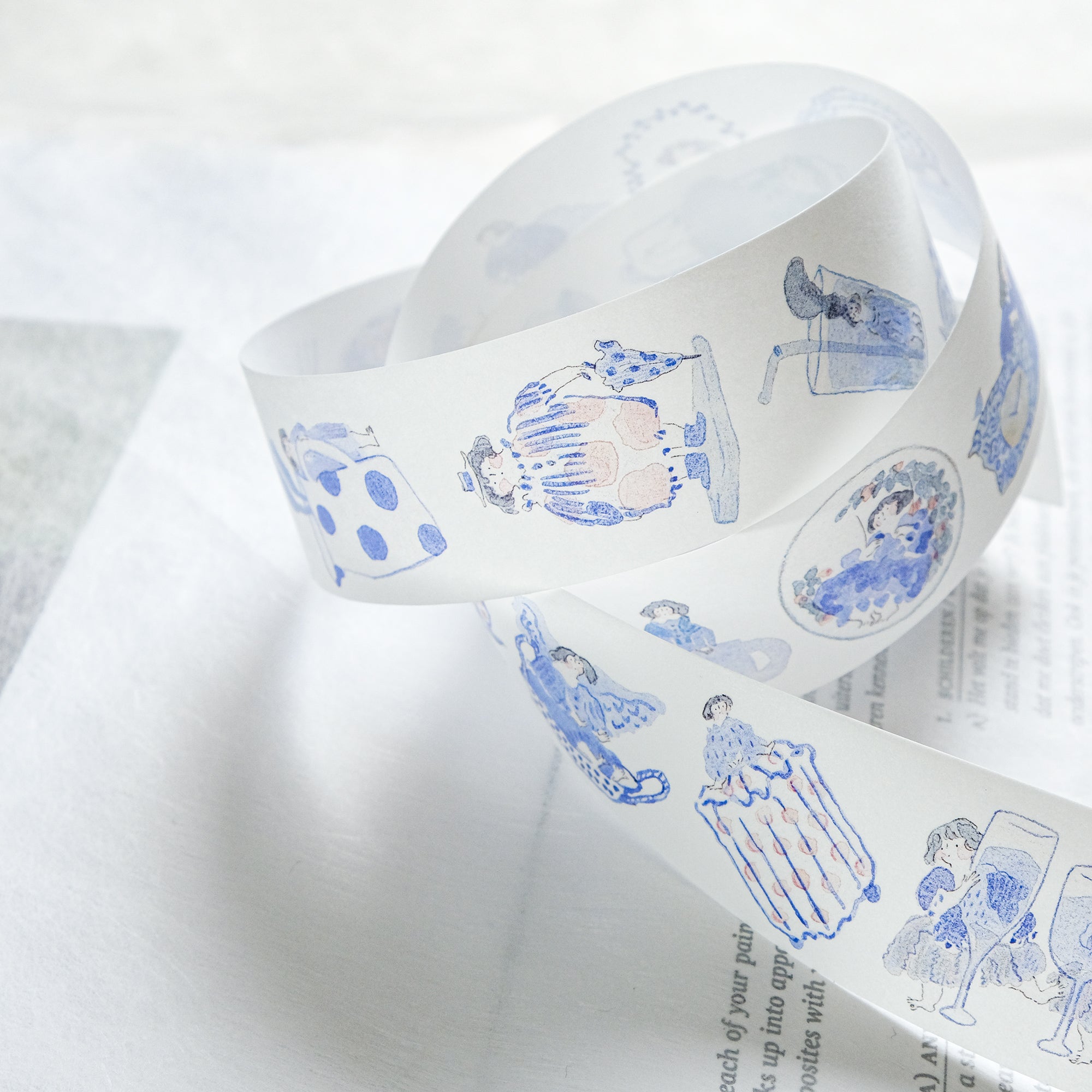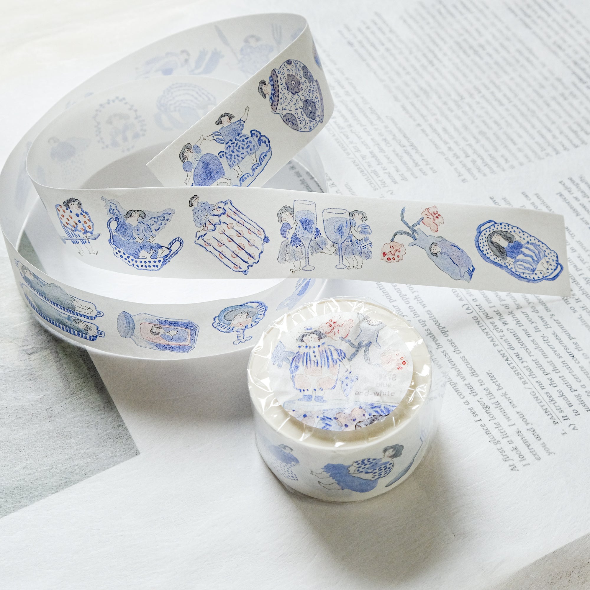 dodolulu "Blue and White" Washi Tape - Japanese masking tape featuring original minimalist illustrations capturing poignant moments in life. Perfect for bullet journals, planners, scrapbooks, and other crafting projects. Made with high-quality Japanese washi tape and comes with release paper for easy application. Add some whimsy to your next project with dodolulu washi tape!