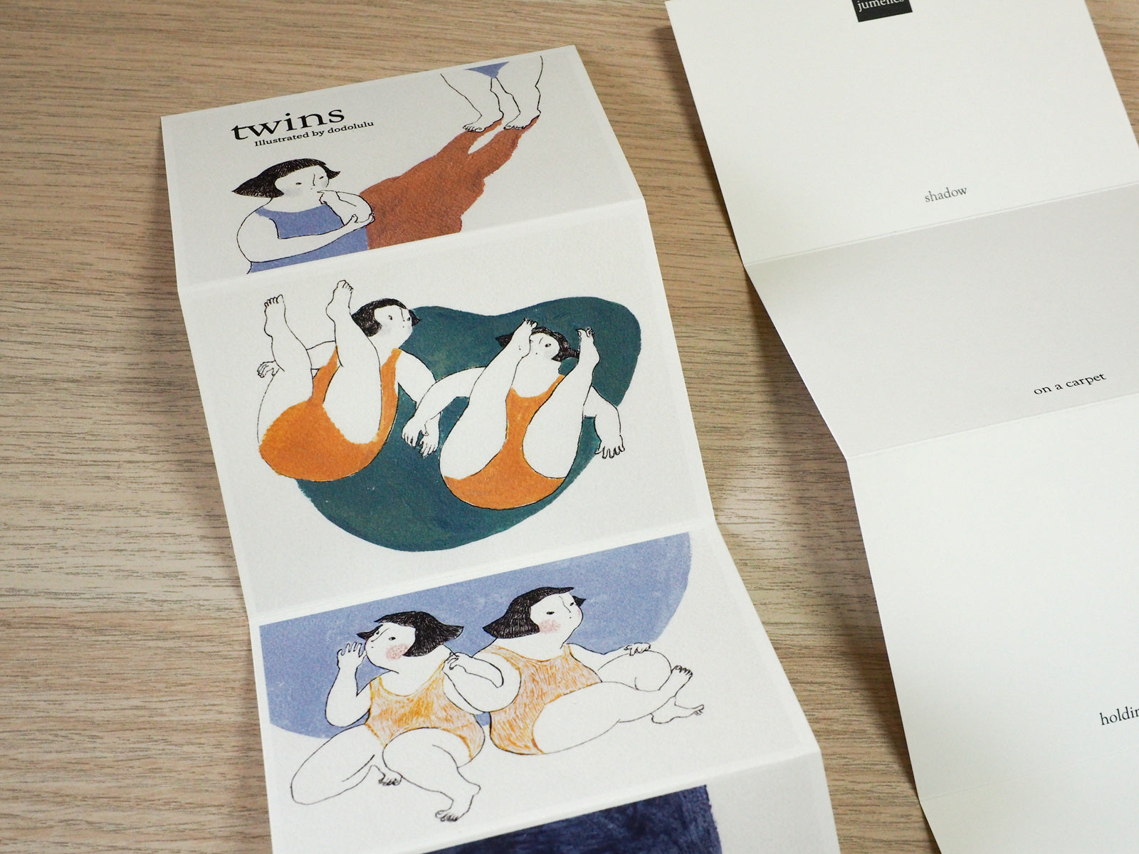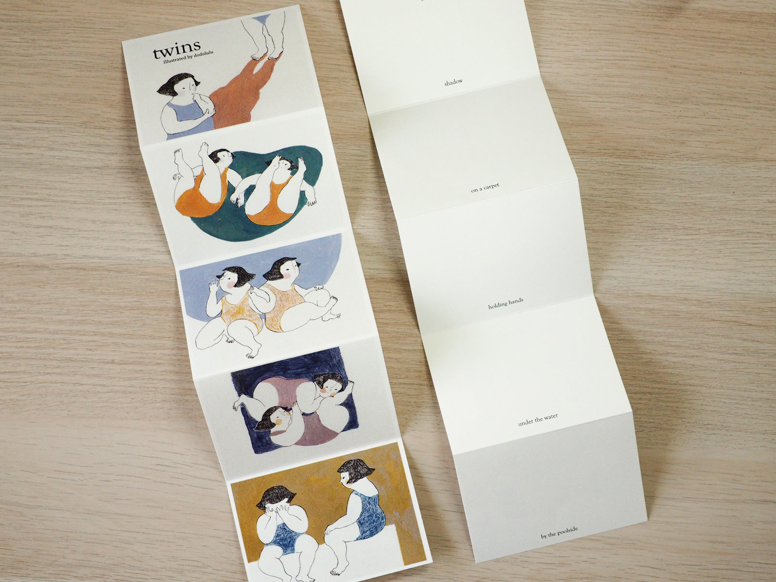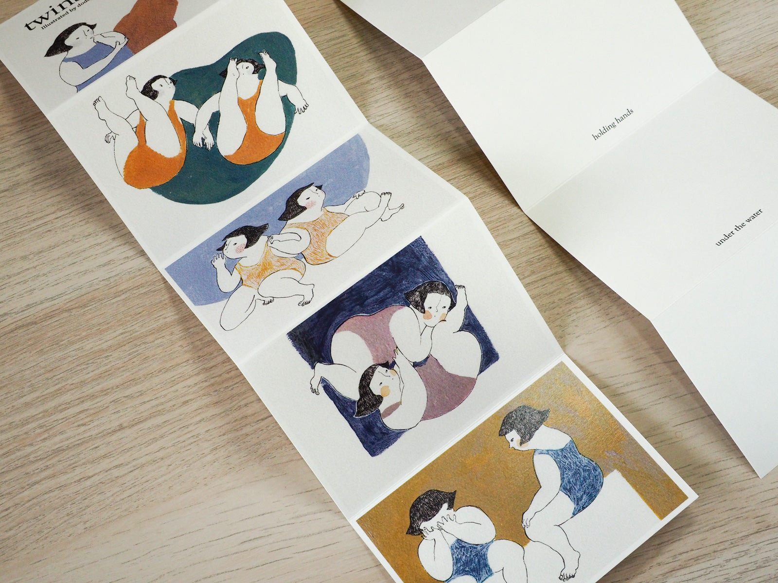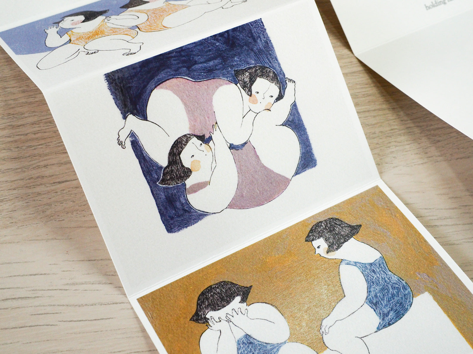 這是我在女兒出生後的作品。因為她看起來跟我很相似,所以我開始想像如果我和她都在同一時間和空間出生,會發生什麼。這一系列的5幅畫作印刷在這小冊上,以作紀念。