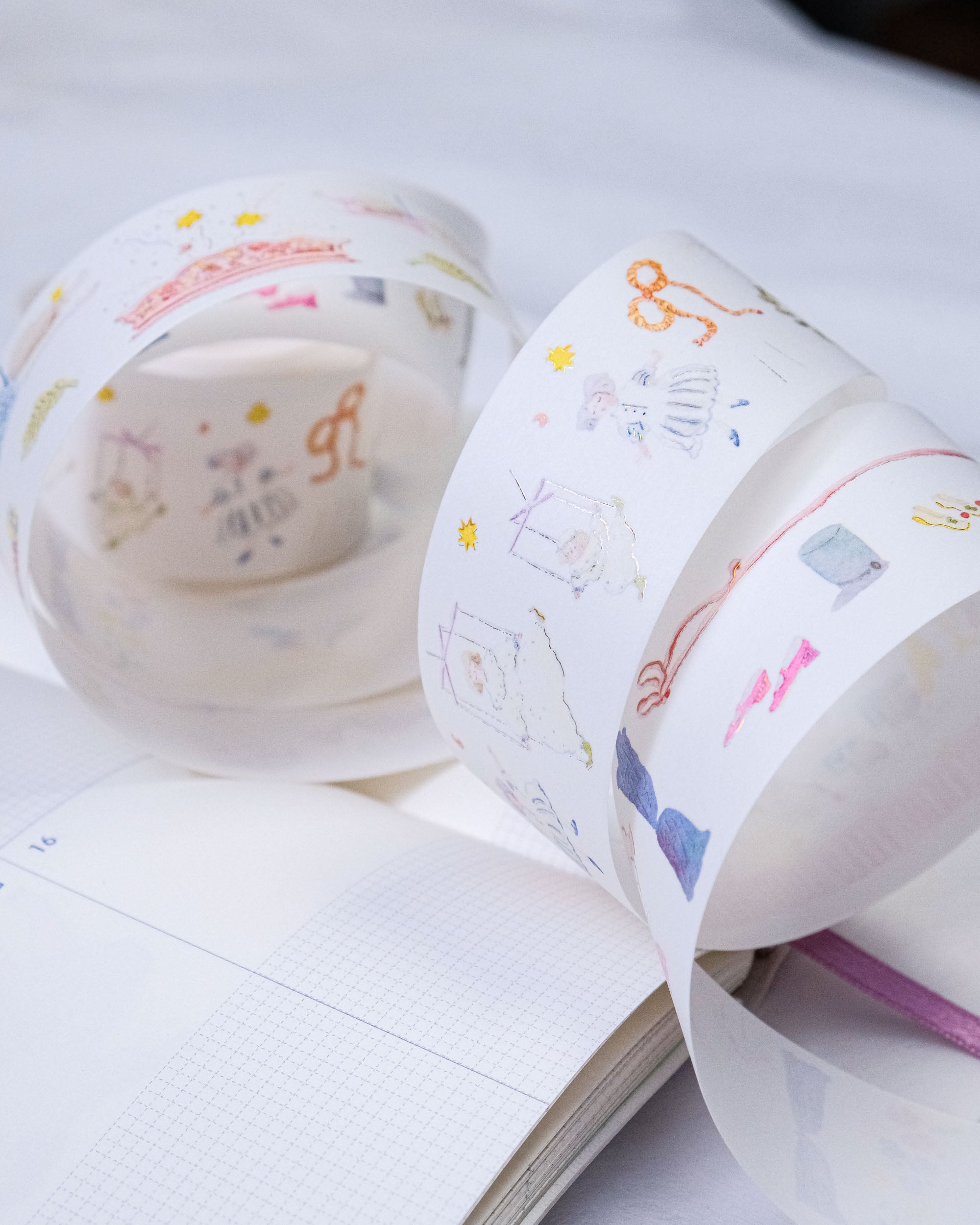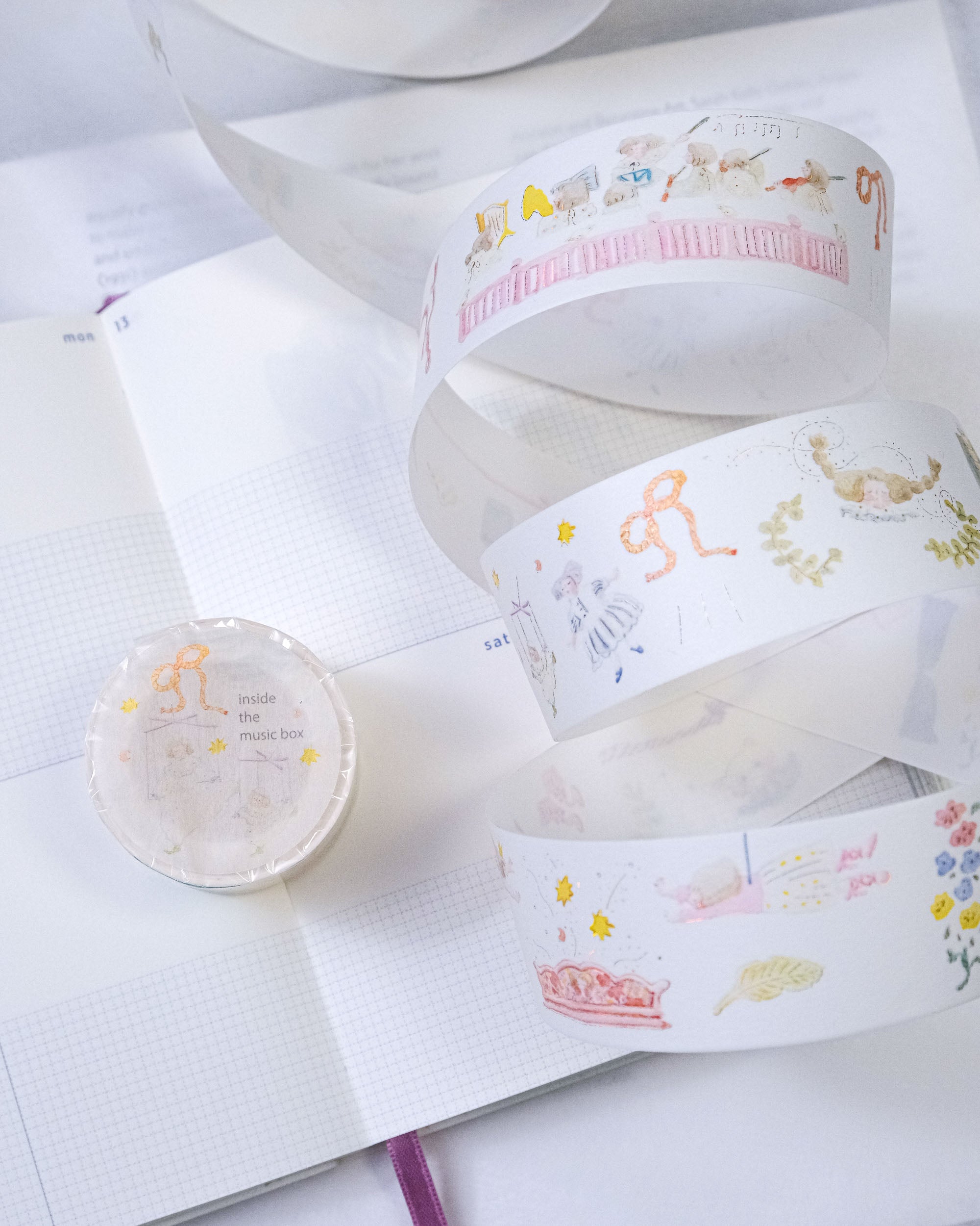 「旋律之外」:燙金工藝和紙膠帶承載音樂盒的柔美音符,3.5cm x 5m,80cm 循環。和紙的溫柔質地與低調的燙金細節相融,附有離型紙,為熱愛手帳與文具的您,獻上一份詩意的簡約之美。